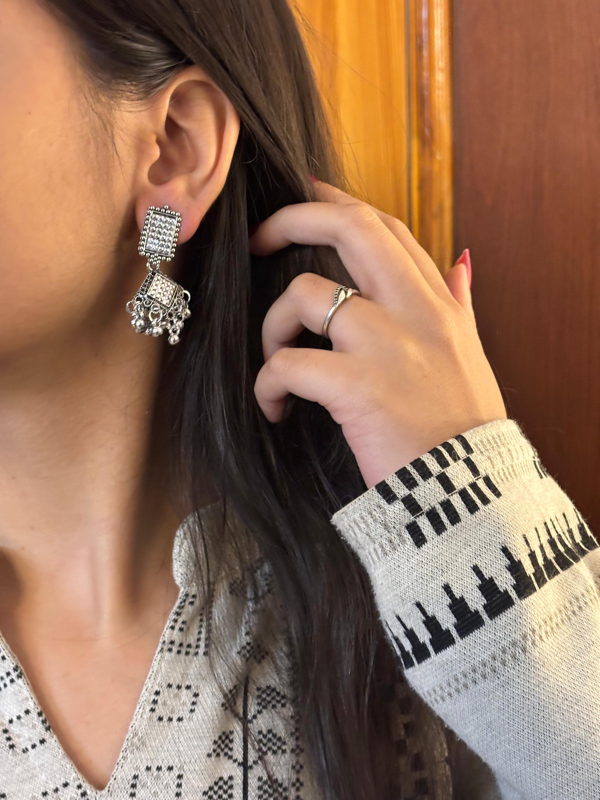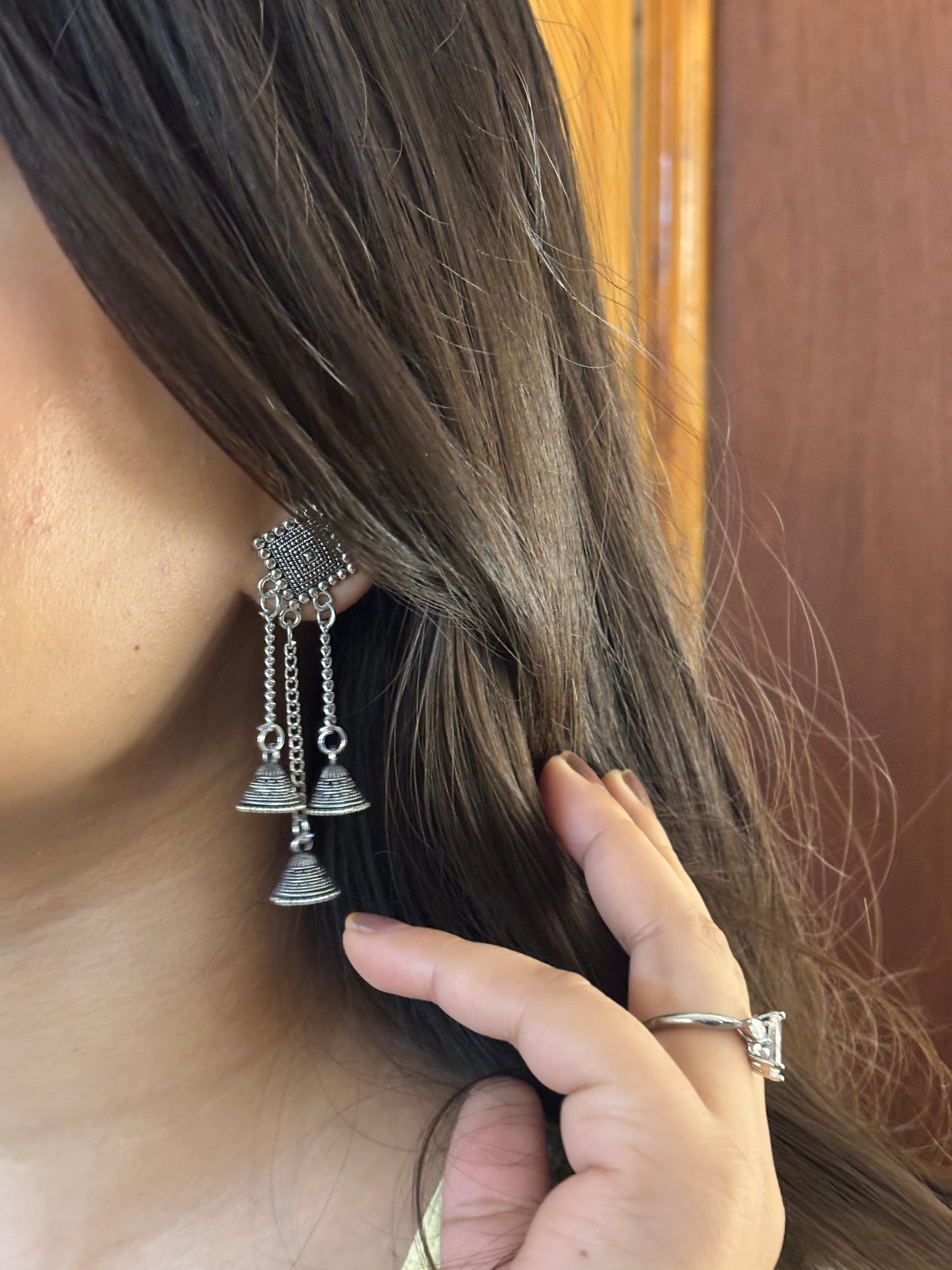 - Silver square & chain jhumka earrings β Square oxidised stud paired with chain-linked mini jhumkas for a layered look.